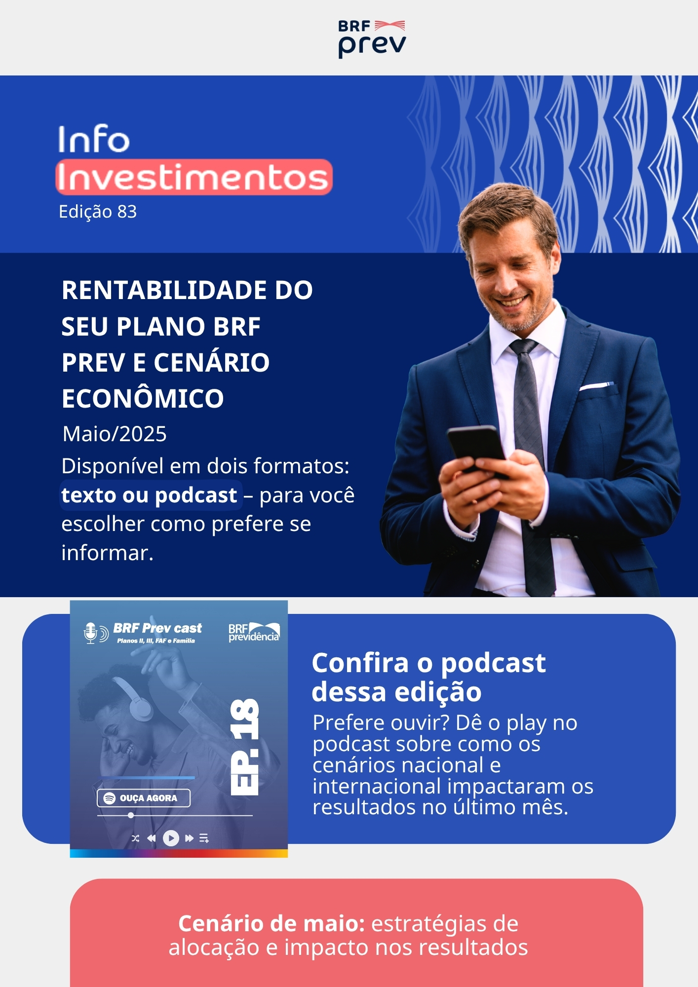 Confira a rentabilidade dos planos da BRF Prev e como eles se comportaram em relação aos principais índices do mercado em maio. Também preparamos uma análise do cenário econômico do mês, disponível em dois formatos: texto ou podcast – para você escolher como prefere se informar.